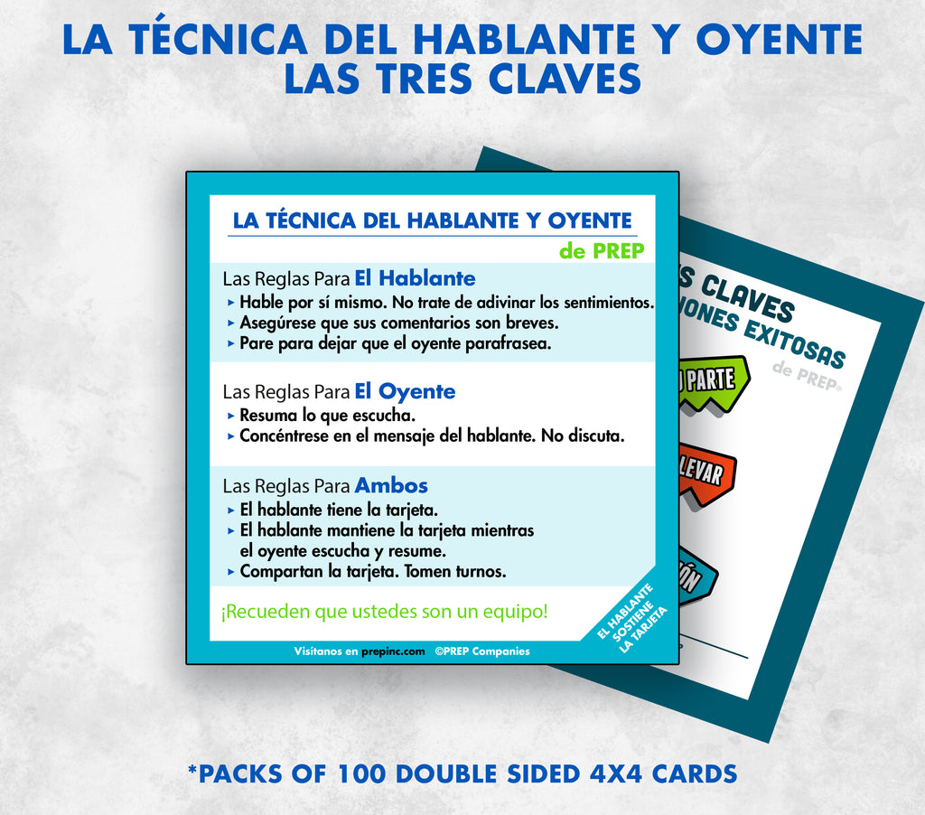 This 4x4 card has the Speaker Listener Technique on one side, and the 3 Keys to a Successful Relationship on the other. It is a great tool for your clients. Comes in packs of 100. This version is translated to Spanish.